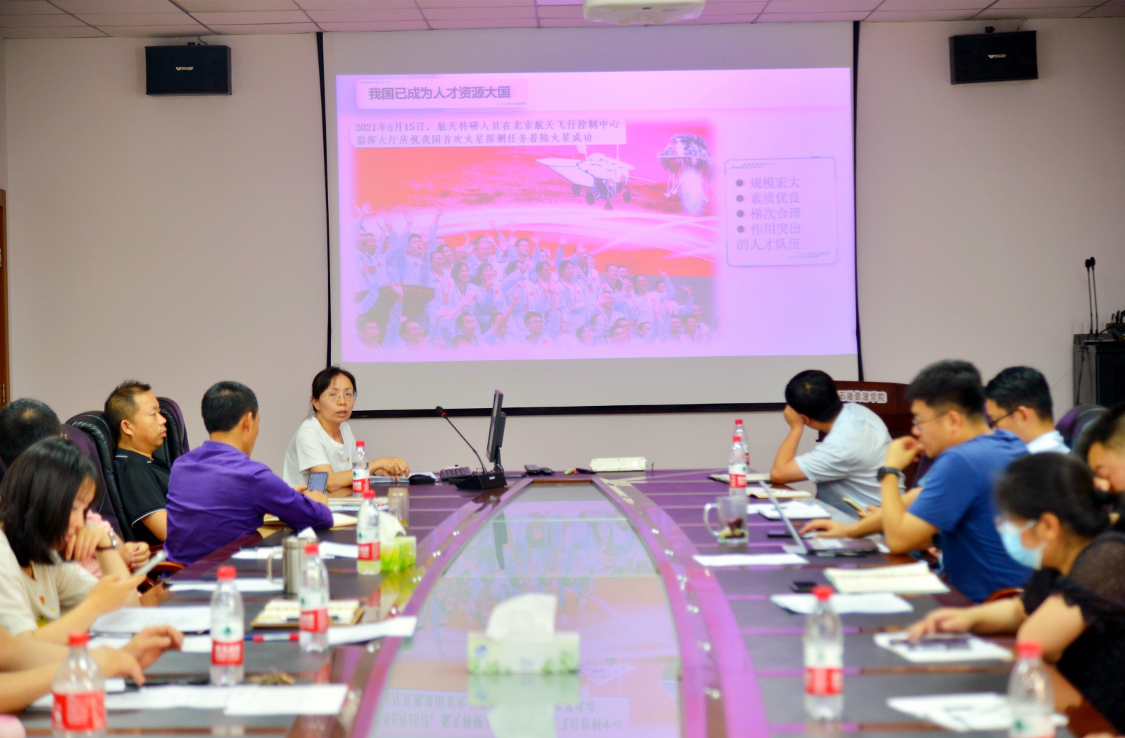 (通讯员 余为)6月13日下午,在石油科技大楼D318公司党委书记王丽同志给中心组成员、科级以上干部、支部委员,以《聚天下英才 筑强国之基》为题上了一堂人才强国党课。