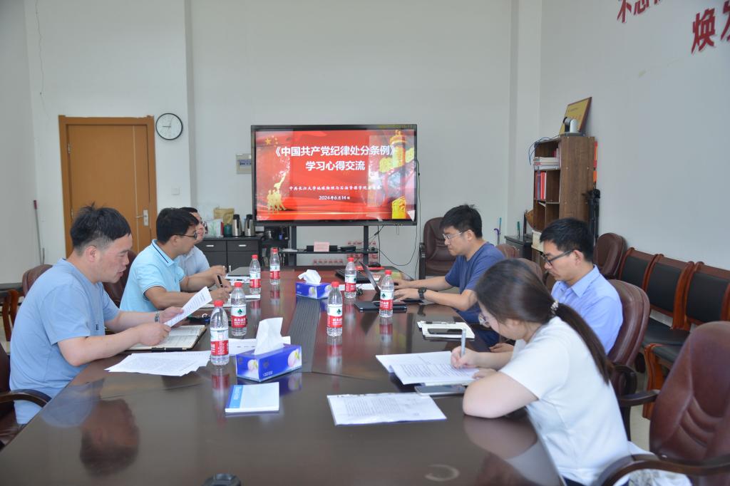 会后,中心组成员结合近期党纪学习教育的心得体会和自身的成长经历、工作实践,从思想认识、履职感悟等方面进行了交流分享。周俊分享道,自开展学习《条例》以来,对党的纪律要求有了更加清晰地认识。作为分党委书记,在今后的学习和工作中,要做到如下几点:强化宗旨意识,保持政治定力、坚持自我检查,做到知行合一、坚守廉洁底线,维护纪律权威、落实主体责任,认真执行《条例》。并将以此次学习为契机,将所学内化于心、外化于行,不断提升自身综合素质,以实际行动践行党的宗旨,做一名忠诚干净担当的共产党员。中心组成员纷纷表示通过学习《条例》认识到纪律对于党的建设和发展的重要性,也认识到每一名党员必须严格遵守党的纪律,要以高度的自觉性践行党规党纪,同时不断提高自己的政治素质和工作能力,为党的事业贡献自己的力量。