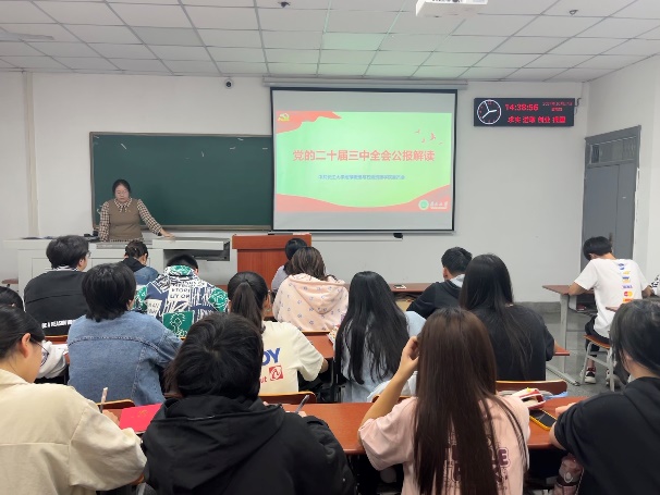在微党课环节,本科生第二党支部书记游菁对党的二十届三中全会公报进行了深入解读。她强调要更加紧密地团结在以习近平同志为核心的党中央周围,高举改革开放旗帜,凝心聚力、奋发进取,为全面建成社会主义现代化强国、实现第二个百年奋斗目标,以中国式现代化全面推进中华民族伟大复兴而努力奋斗!
