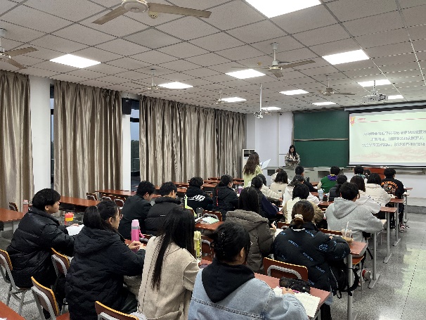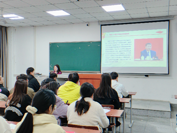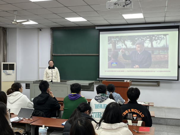 在微党课环节,本科生第一党支部书记董勤文同志围绕习近平总书记考察湖北重要讲话精神,从科技创新与产业创新、全面深化改革与开放、城乡融合与乡村振兴、文化资源保护与创新等多个角度进行阐述。她强调全体党员要深刻领会习近平总书记讲话的丰富内涵与实践要求,担当文化保护与创新使命,在各自岗位上积极作为,为奋力谱写中国式现代化湖北篇章贡献力量。