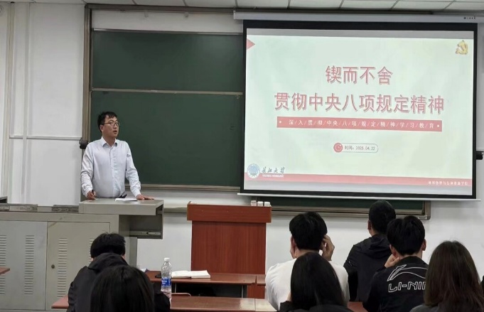 研究生第二党支部焦简金同志以“锲而不舍贯彻中央八项规定精神”为主题讲授微党课。他指出,党的作风就是党的形象,关系人心向背,决定党和国家事业成败。他呼吁党员干部要深入学习习近平总书记关于加强党的作风建设的重要论述和中央八项规定及其实施细则精神,切实增强贯彻落实的思想自觉和行动自觉。
