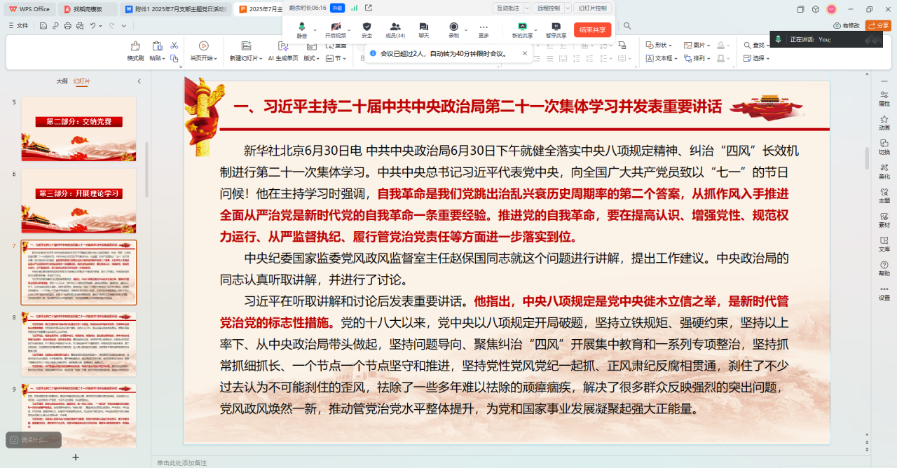 理论学习环节,集中学习了习近平总书记重要讲话和重要指示批示精神:“习近平在中共中央政治局第二十一次集体学习时强调 坚持从抓作风入手推进全面从严治党 把新时代党的自我革命要求进一步落实到位”“习近平在山西考察时强调 努力在推动资源型经济转型发展上迈出新步伐 奋力谱写三晋大地推进中国式现代化新篇章”;深入贯彻中央八项规定精神学习教育相关内容:“石泰峰同志在党的十八大以来深入贯彻中央八项规定精神的成效和经验交流研讨座谈会上的讲话”“王忠林在省委党的建设工作领导小组(扩大)会议上强调‘七查七看’扎实开展学习教育‘回头看’动真碰硬 坚决把查摆问题改彻底治到位”“省委常委会召开学习教育查摆问题情况检视交流会 切实增强深查实改坚定自觉 推动学习教育取得更大成效 王忠林主持并作总结讲话”“王忠林到荆州调研并主持召开座谈会时强调 坚定信心 加压奋进 努力当好江汉平原高质量发展排头兵”“云南省曲靖市统计造假、政治生态恶化的典型案例”“湖北省委学习教育工作专班 省纪委办公厅 关于黄冈市蕲春县7名党员干部在学习教育期间违规吃喝严重违反中央八项规定精神问题的通报”“湖北省委学习教育工作专班 省纪委办公厅 关于江陵农村商业银行3名管理人员在学习教育期间违规吃喝严重违反中央八项规定精神问题的通报”“中共湖北省委深入贯彻中央八项规定精神学习教育工作专班 中共湖北省纪委办公厅关于7起党员干部、公职人员酒驾醉驾典型问题的通报”;公司会议精神:“坚定信心决心 铆足干劲拼劲 公司召开2025年暑期工作部署会”“锚定一流目标 建功支点建设 王建平讲授‘七一’专题党课”等。