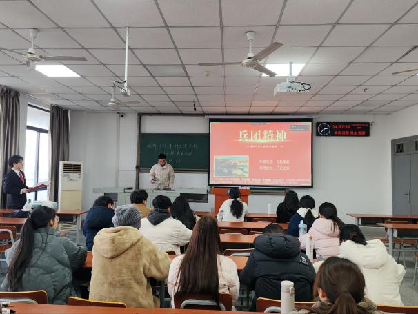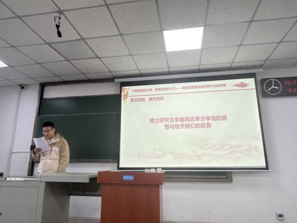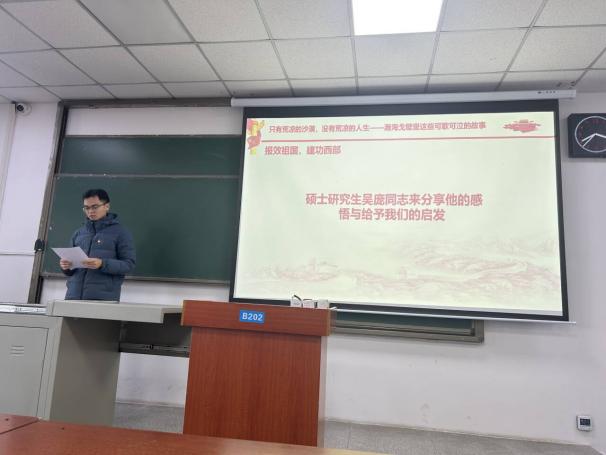 在党课环节,本科生第二党支部许棋胜同志以“只有荒凉的沙漠,没有荒凉的人生——兵团精神扎根心中”为主题讲授党课。他通过历史资料、典型案例和详实数据,系统介绍了新疆生产建设兵团的发展历程、辉煌成就,深入阐释了“热爱祖国、无私奉献、艰苦创业、开拓进取”的兵团精神,号召全体党员以兵团人为榜样,将个人理想融入国家发展大局,在专业学习和实践中践行初心使命。