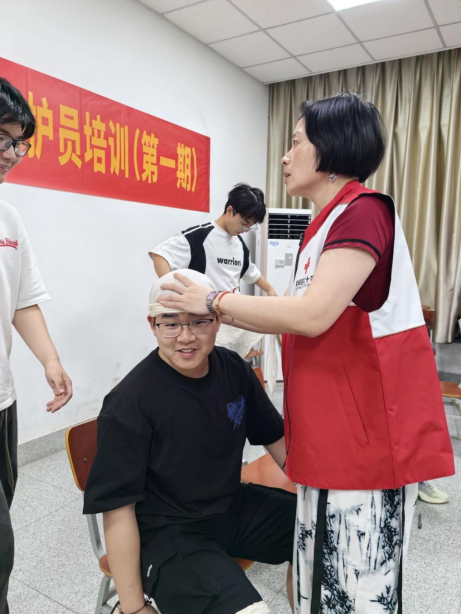 系统教学之后,同学们分成五大组进行实操练习及专业考核。红十字应急救护培训师利用心肺复苏模拟人分步骤生动演示了判断呼吸、打开气道及胸外按压等操作要领,手把手指导大家进行实操练习,教授大家如何在突发事故中进行科学救助。