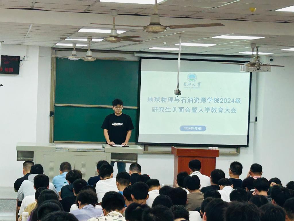 “要继承前人的智慧成果,更要勇于站在巨人的肩膀上,眺望更远的风景”。研究生新生代表测井QX241班梅前哲发言,他表达了对研究生生活的憧憬和期待,他号召同学们在科研的道路上携手并进,相互扶持,共同成长,用智慧和汗水,为这个世界增添一抹不同的色彩。