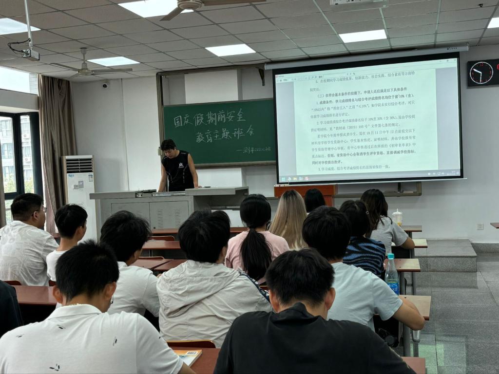 各班班长向大家讲解本次班会内容,呼吁大家国庆假期注意安全,并从防范电信网络诈骗、交通消防食品安全、防欺凌、禁止毒品、防溺水、人身安全、宿舍安全等几方面进行展开。此外,班会还向同学们讲解了本次先进集体和先进个人推选规则,请符合条件的同学积极申报,并号召大家认真学习,积极参与员工工作。