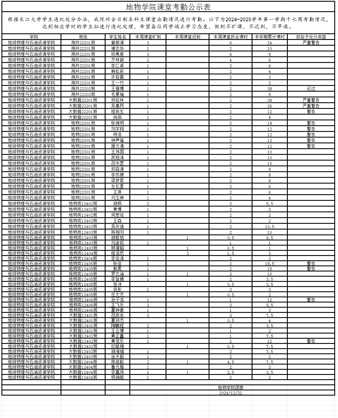 公司对全日制本科生课堂出勤情况进行考勤。以下为2024-2025学年第一学期第十七周考勤情况,根据《英国365上市公司员工违纪处分办法》,达到相应纪律处分学时的员工拟进行违纪处理。希望各位同学端正学习态度,做到不旷课,不迟到,不早退。