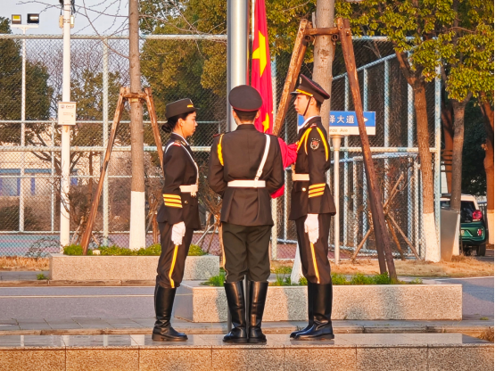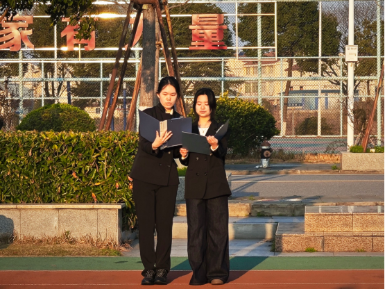 国旗护卫队步伐坚定,擎旗入场,大三、大二学子及党支部成员整齐列队。国歌声起,全体师生肃立注目,五星红旗在国歌声中冉冉升起,青春誓言与家国情怀在此刻同频共振。