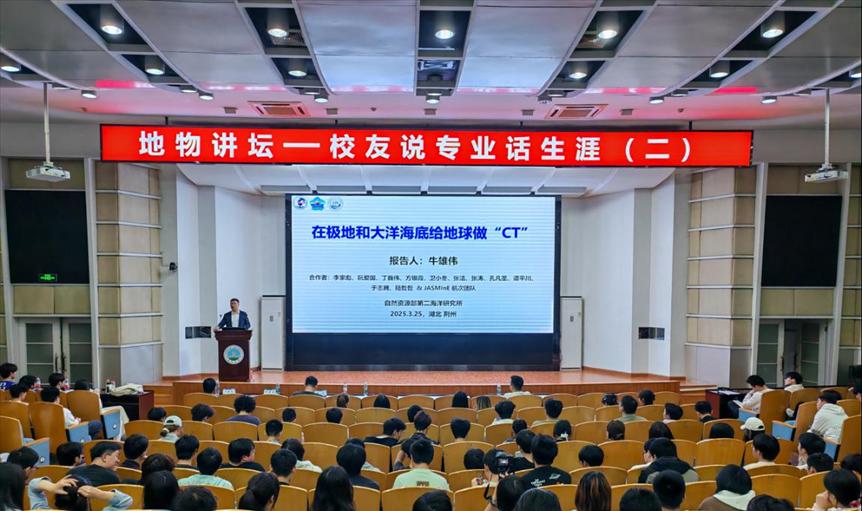 (通讯员 张志凝 纪皓楠 罗滢滢)3月25日晚,公司地球物理学2004级员工、自然资源部第二海洋研究所研究员牛雄伟应邀做客地物讲坛“员工说专业话生涯”第二讲,在东校区12教405报告厅作题为“在极地与大洋海底为地球做‘CT’”的主题报告。公司固体地球物理系主任周磊,2024级辅导员谭辰阳,340余名2024级本科生参加报告会。报告会由公司党委副书记焦简金主持。