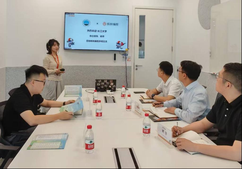 18日上午,焦简金带队走访北京聪明核桃教育科技有限公司武汉基地。企业全国校招负责人赵鹏程介绍了编程教育行业发展态势及复合型人才需求,提出校企合作意愿,企业武汉基地校招负责人李梦宇就企业文化、办公环境和公司架构进行了重点介绍,焦简金介绍公司学科专业优势和毕业生情况。双方围绕人才培养、就业供需、常态化互访等深入交流。
