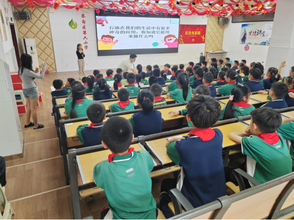 在“地球宝藏大发现”环节,志愿者通过实物标本展示和情景模拟,带领员工认识水资源、矿物资源和能源矿产。“石油不仅能让汽车跑起来,还能变成你们手中的塑料玩具”。 当主讲人武凌帆将汽油样品与塑料模型对比展示时,孩子们纷纷凑近观察。互动实验 “模拟石油开采” 更是将课堂气氛推向高潮,员工们分组操作简易抽油机模型,直观感受资源勘探的科学原理。