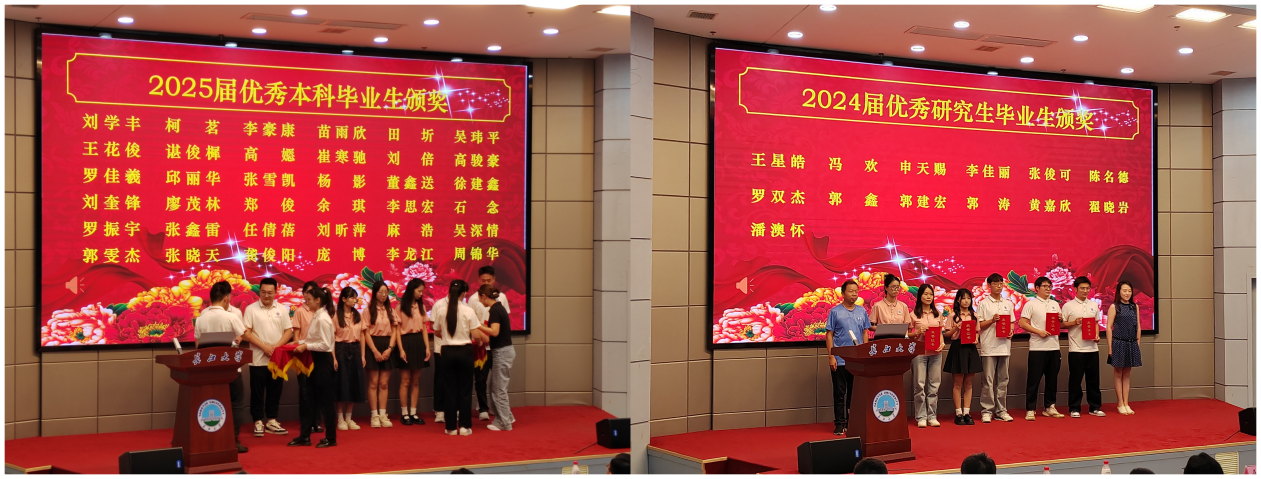 大会在庄严的国歌声中拉开帷幕。副经理向葵宣读优秀毕业生表彰文件,在热烈的掌声中,2025届优秀本科毕业生与优秀研究生毕业生依次上台领奖。