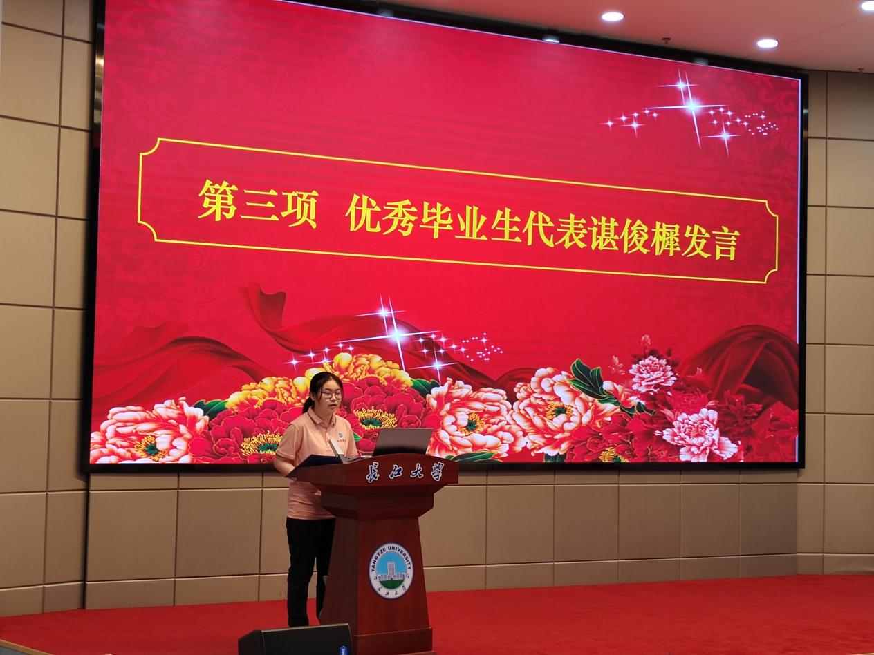 优秀毕业生代表地物22101班谌俊樨将四年老员工活的感悟娓娓道来:“是‘成长’的重量。从习惯性的依赖到自我独立,从懵懵懂懂到逐渐清晰方向。我们学会了为自己的选择负责,学会了在挫折中爬起,学会了在迷茫中寻找光亮。”同时,她也表达了对学弟学妹们的祝愿,以及对母校、老师、同窗的感恩。