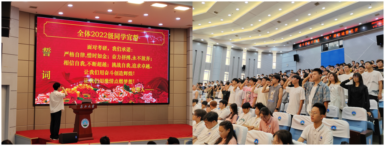 2022级员工代表许荣政从自己考研的缘由、考研备考经验进行了个人分享。“严格自律,惜时如金;挑战自我,追求卓越!”在许荣政的领誓下,300余名学子以青春誓言表露考研决心,铿锵有力的宣誓声响彻会场。