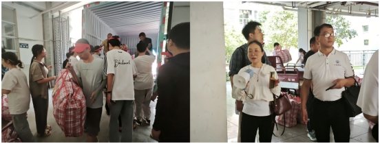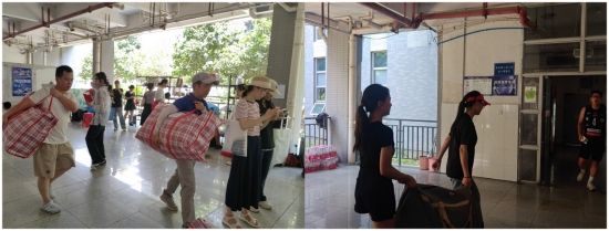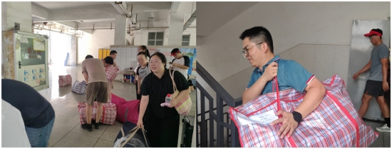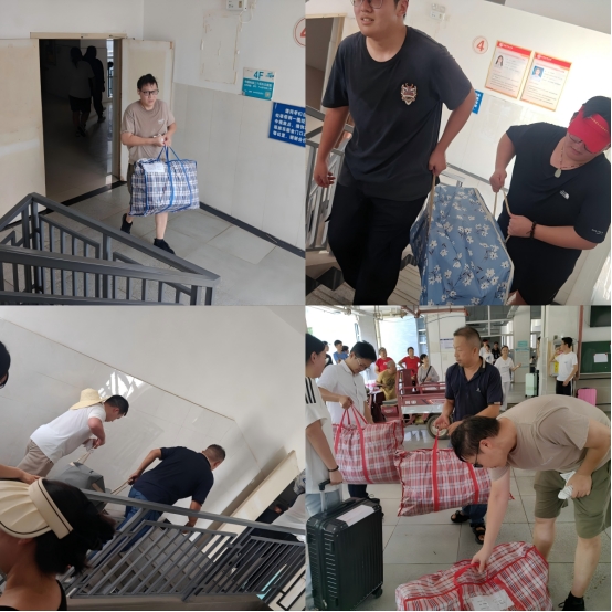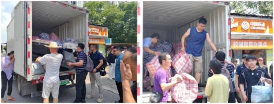 为保障搬迁工作顺利开展,在党委学工部和武汉校区管委会的指导下,公司提前制定详细方案,成立专项工作组,统筹调度货运车辆14台、通勤客车7辆。搬迁当日,师生志愿者顶着高温往返于楼宇与货车之间,全程参与物资分装、行李搬运及秩序维护。通过“人员—车辆—楼栋”三级联动机制,实时核对行李标签信息,确保千余件行李无错漏、无损坏,整个搬迁过程高效有序。