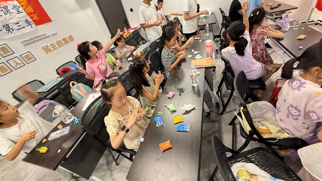 分发材料后,孩子们迫不及待地拿起黏土开始创作。有的孩子结合之前课程学到的知识,捏出了太阳能小风车、地球仪等充满科学元素的作品。志愿者们巡回指导,帮助孩子们解决黏合不稳、造型松散等问题,时不时为他们的奇思妙想点赞。
