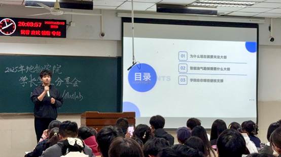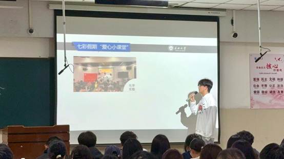 2024级本科生陈海翔、宗睿首先围绕“活动内容、实践意义与个人收获”三大维度,分享了暑期社会实践的丰富经历。他们结合青年服务基层、关爱社会弱势群体、普及科学文化知识等主题,生动讲述了实践过程中的心路历程与成长体会,并向全体新生发出倡议:“青春正好,愿我们携手在实践中找寻方向,共绘属于我们的青春篇章。”