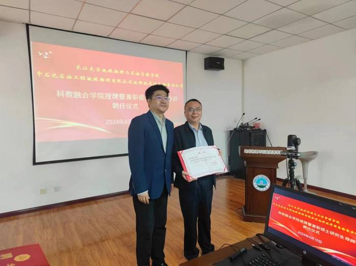 【通讯员:丁曦 秦喜林】为了进一步深化产教融合,4月10日下午,公司与中石化石油工程地球物理有限公司地理地质信息勘查分公司举行“科教融合公司”授牌暨兼职硕士研究生导师聘任仪式,全体院领导以及物探系、固体系领导参加本次会议。中石化石油工程地球物理有限公司地理地质信息勘查分公司总经理戈宝存、首席专家李秀荣及相关部门负责人;公司党委研究生工作部兼研究生院常务副经理关辉、研究生院副经理周玉辉出席会议。仪式由公司党委书记周俊主持。