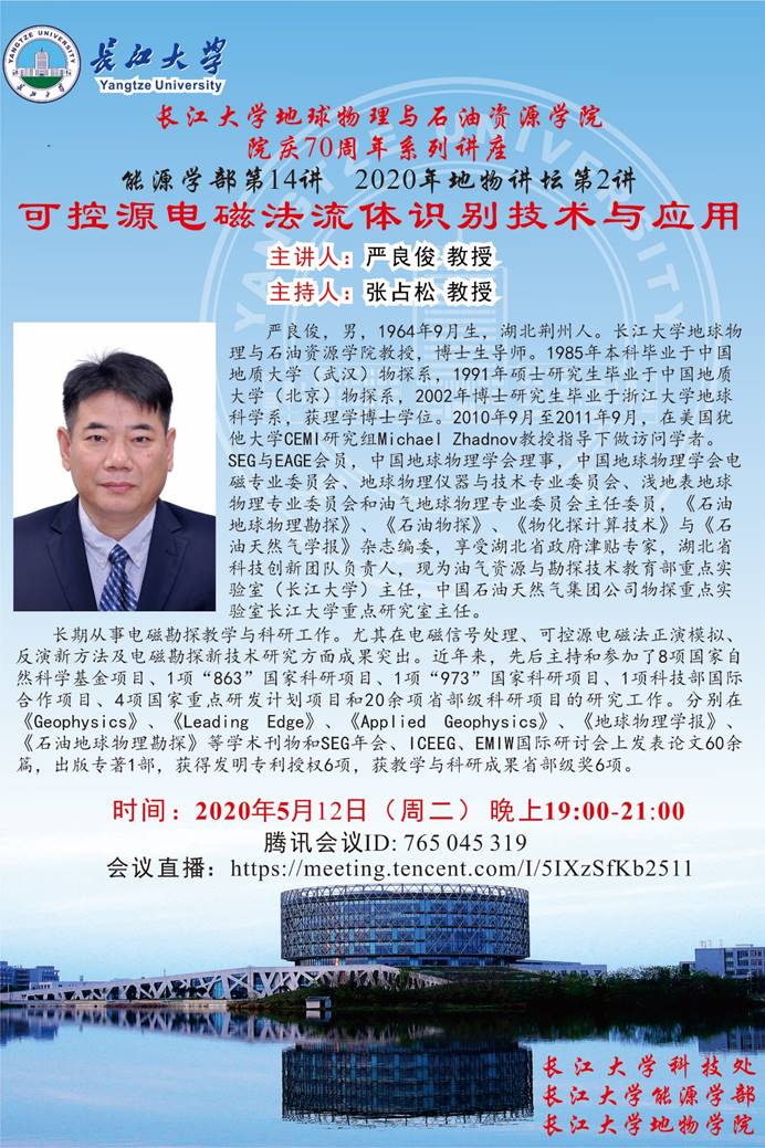 2020年5月12日19点,英国365上市公司严良俊教授以“可控源电磁法流体识别技术与应用”报告拉开了院庆70周年系列线上讲座的序幕。该讲座同时也是能源学部第14讲。