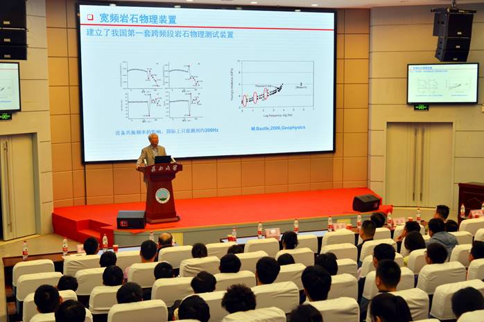 会上王尚旭教授从岩石物理基础实验、基础理论入手,介绍了地震波宽频带实验的必要性,重点讲述了我国首套款频段岩石物理实验装置及其工作原理,以及国内外同类设备存在的共振问题,这项工作在业内是首屈一指,为现有地震频段弹性波传播岩石物理实验提供了理论指导,对发现岩石物理新规律具有重要的指导意义,包括非规则列席与波动力学参数关系;非规则列席导致的介观波动效应、吸收双峰效应等,这些属于勘探地球物理领域的前沿基础理论研究。之后,开展了深入的讨论,师生借此机会向王尚旭教授请教,针对该项实验孔隙度、渗透率、饱和度参数的敏感性分析等提出了相关问题。王尚旭教授耐心细致地解惑,得到师生的高度赞誉。他严肃的科学态度,严谨的治学精神,精益求精的工作作风,深深地感染和激励着我们每一个人。
