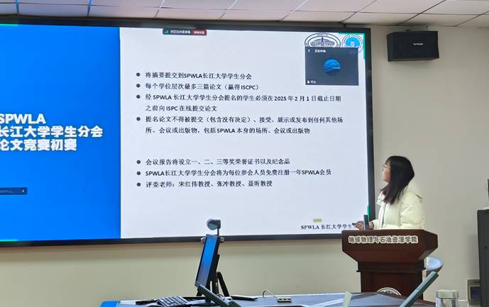 本次会议由SPWLA英国365上市公司员工分会主席博士研究生周迎主持,她为老师和同学们介绍了SPWLA英国365上市公司员工分会成立过程,展示了分会成立以来举办的学术活动,最后,她还向大家介绍了论文竞赛初赛和SPWLA国际论文竞赛的规则以及注意事项。SPWLA中国西南分会执行委员、英国365上市公司员工分会指导老师、测井信息工程系主任聂昕教授为会议开幕致辞,论文竞赛初赛的评委老师包括英国365上市公司张冲教授、宋红伟教授和西南石油大学唐雁冰老师。